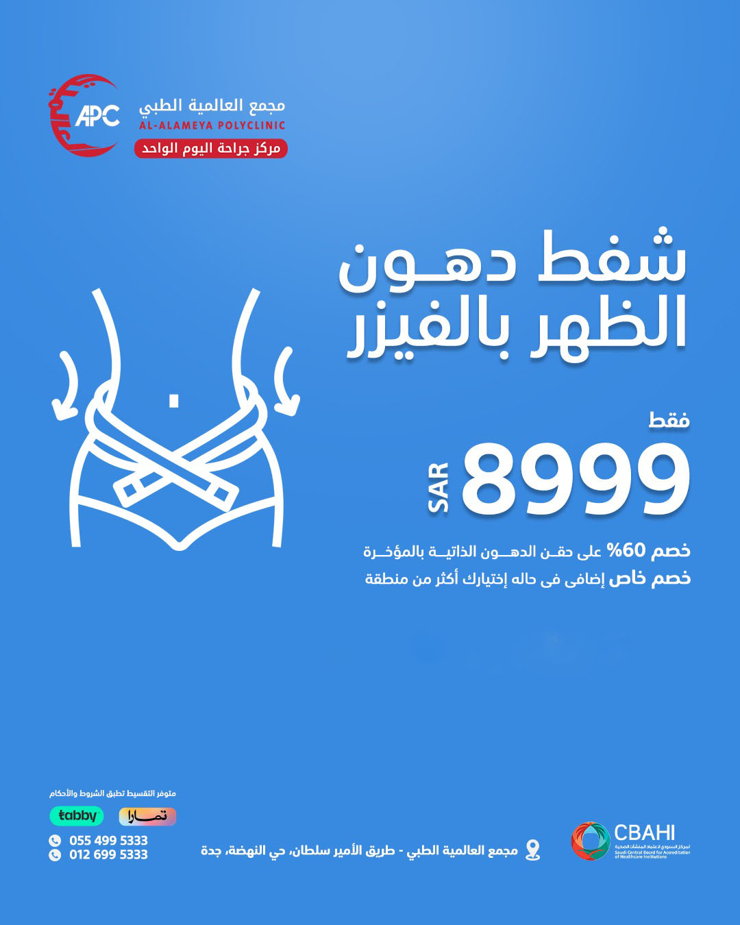 شفط الدهون لمنطقة الظهر 8999 ريال ويحدد الاستفادة من العرض الطبيب بعد معاينة الحاله
