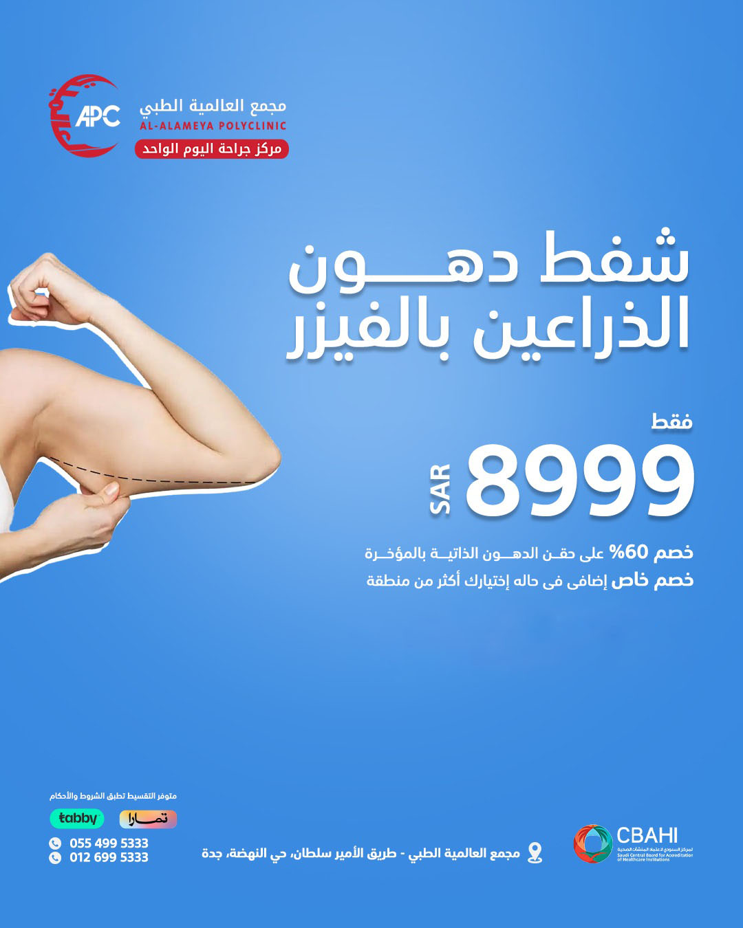شفط الدهون منطقه الذراعين ( الزنود ) 8999 ريال ويحدد الاستفادة من العرض الطبيب بعد معاينة الحاله