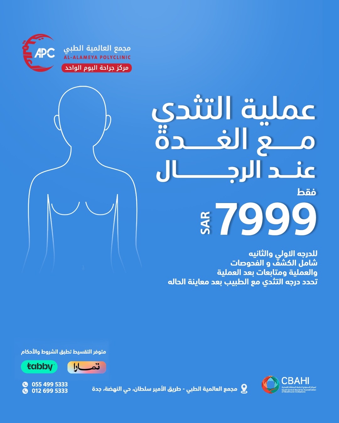 عملية التثدى عند الرجال 7999 ريال للدرجة الاولى والثانية شامل الكشف والفحوصات والعملية ومتابعات بعد العملية تحديد التكلفة مع الطبيب بعد معاينه الحاله