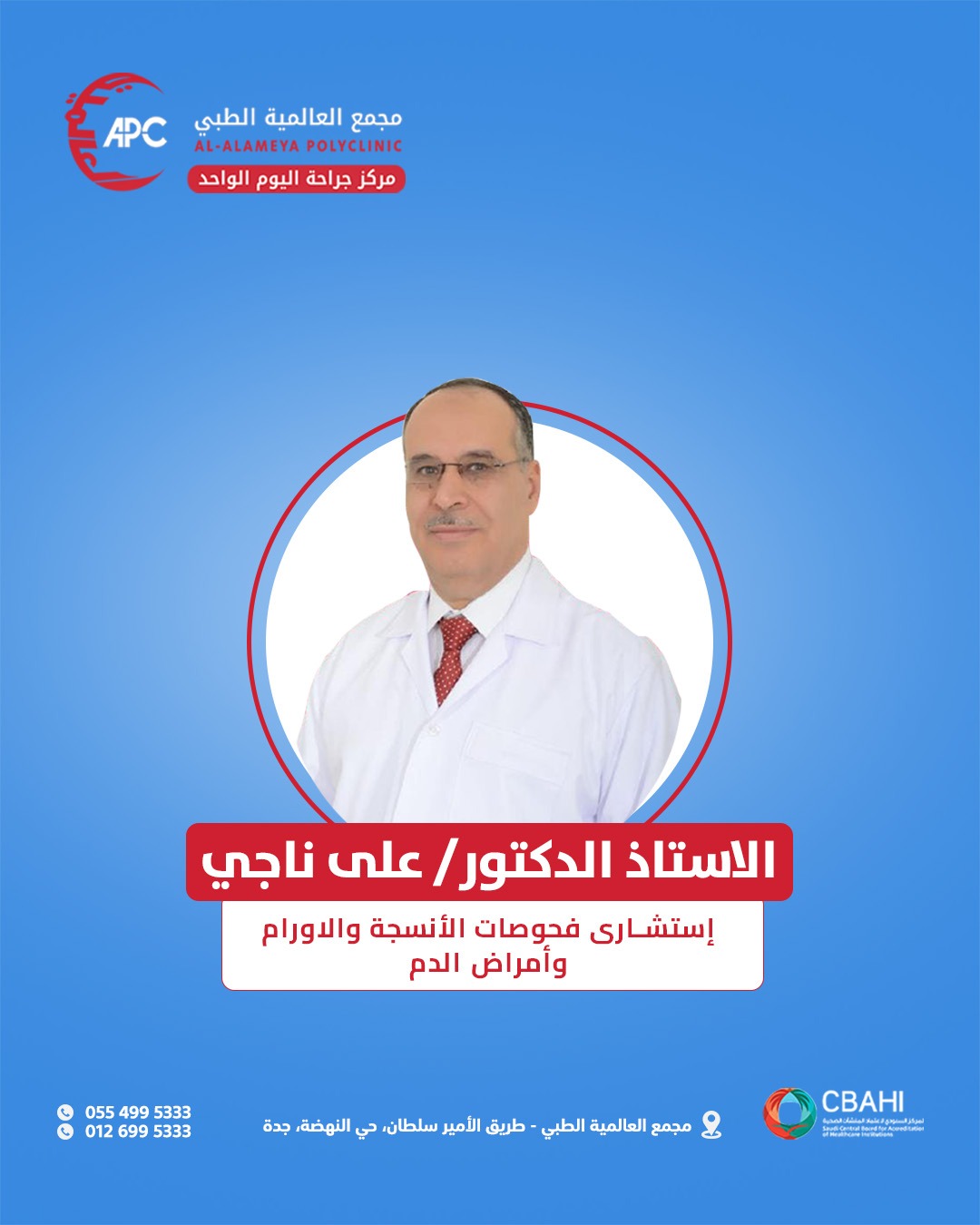 الاستاذ الدكتور / على ناجى - إستشارى فحوصات الأنسجة والاورام وأمراض الدم - مدير المختبرات الطبية - المدير الطبى
