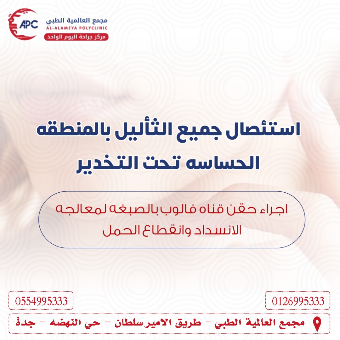استئصال جميع الثأليل بالمنطقه الحساسه تحت التخدير & اجراء حقن قناه فالوب بالصبغه لمعالجه الانسداد وانقطاع الحمل